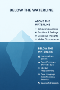 The “Reading Below the Waterline” method is rooted in Proverbs 20:5 and shaped by TGT’s gospel-centered theological framework. True transformation addresses what operates beneath conscious awareness, cooperating with the Spirit’s work to align our lives with the new heart we’ve been given in Christ.